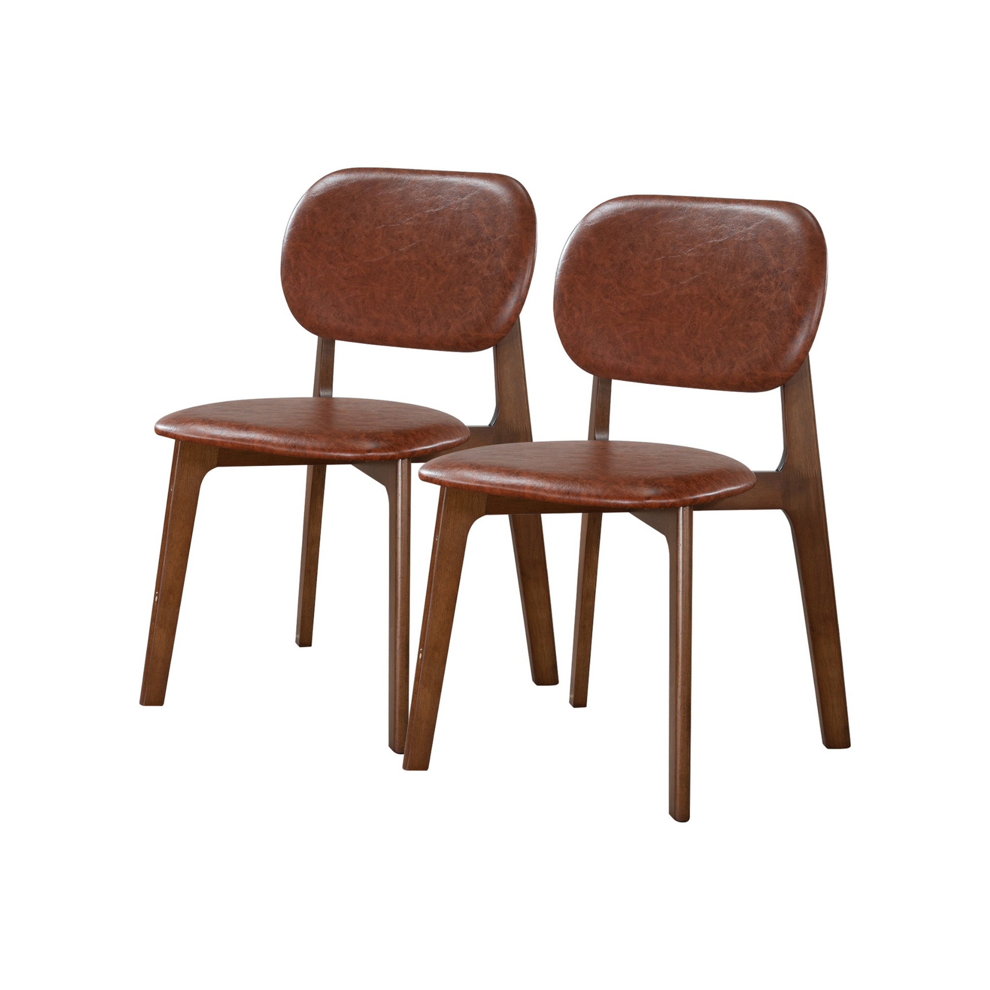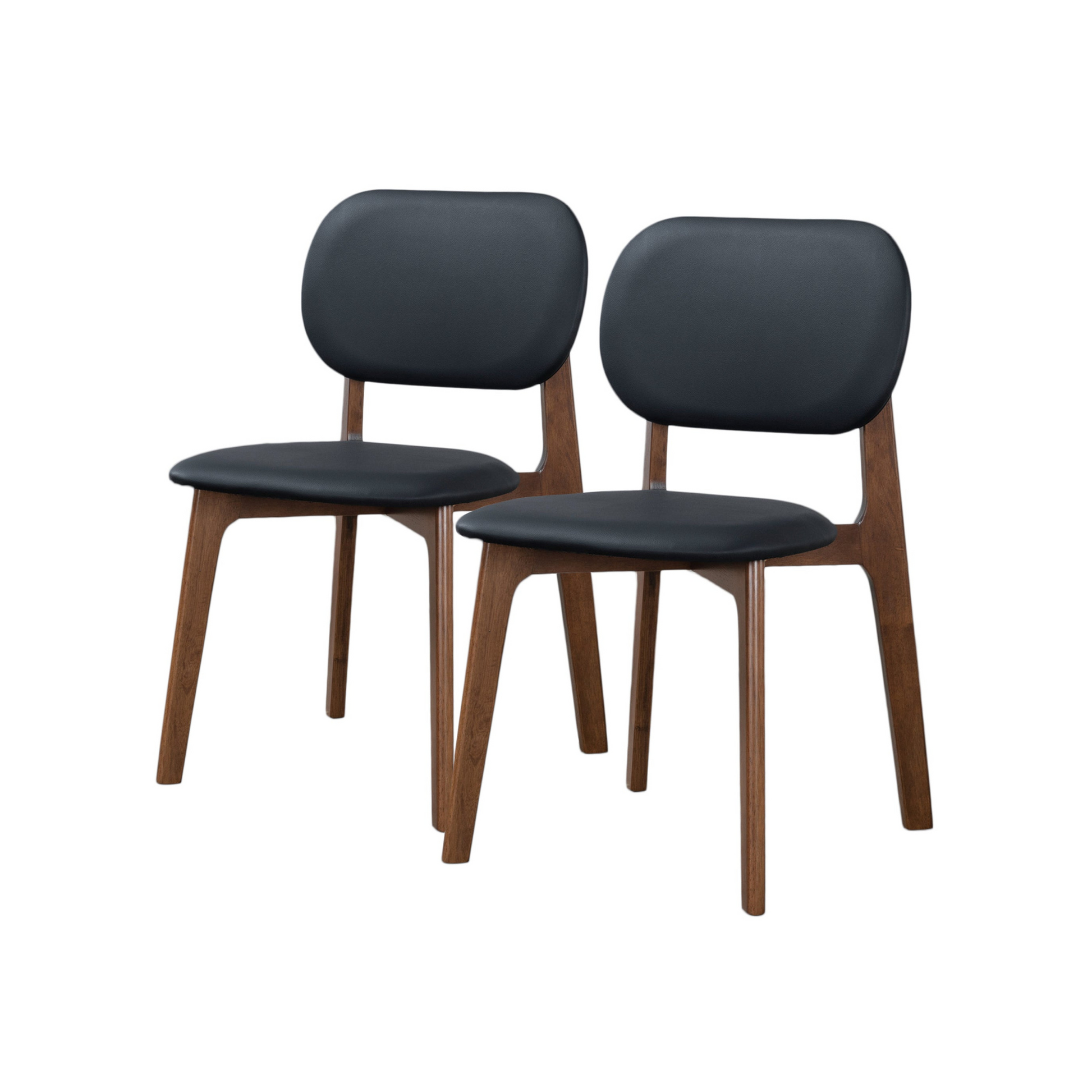 Set of 2 Solid Wood Dining Chairs, Black Vegan Leather Upholstery, Walnut Colored Rubberwood Base, Mid Century Modern Design
