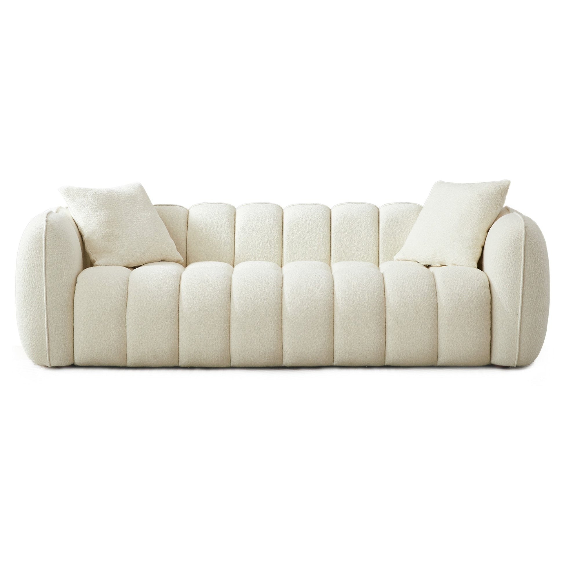 Introducing Our Channel Tufted Sofa, the perfect combination of style, comfort, and affordability. This 3-seater sofa features a chic mid-century modern design with channel tufting and a cozy boucle fabric that will elevate any living room decor. The cream color adds a touch of elegance, while the solid wood base and legs provide sturdy support.