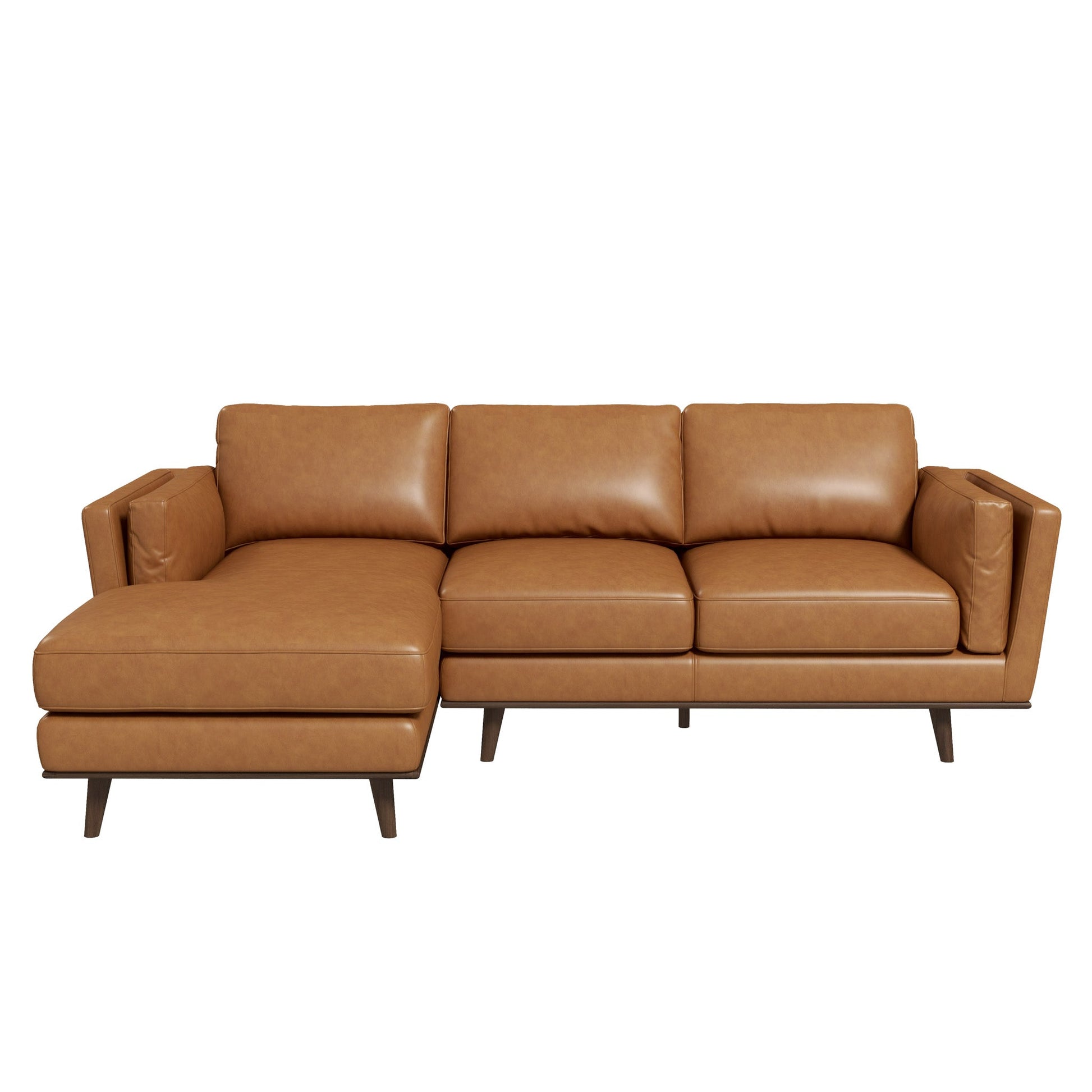 Anchor your space in mid-century modern style with the Aurelia tan genuine leather left sectional. Combining durable, top-quality craftsmanship and high-density foam this sofa will provide you with great comfort and undoubtedly become the centerpiece of your living room, den, urban loft, condo or home office. It is made of genuine leather and can be cleaned with a non-abrasive cleaning solution followed by a quick microfiber cloth. Removable legs allow for simple delivery for tight spaces. Available in a variety of timeless colors, you're sure to find something that matches your decor