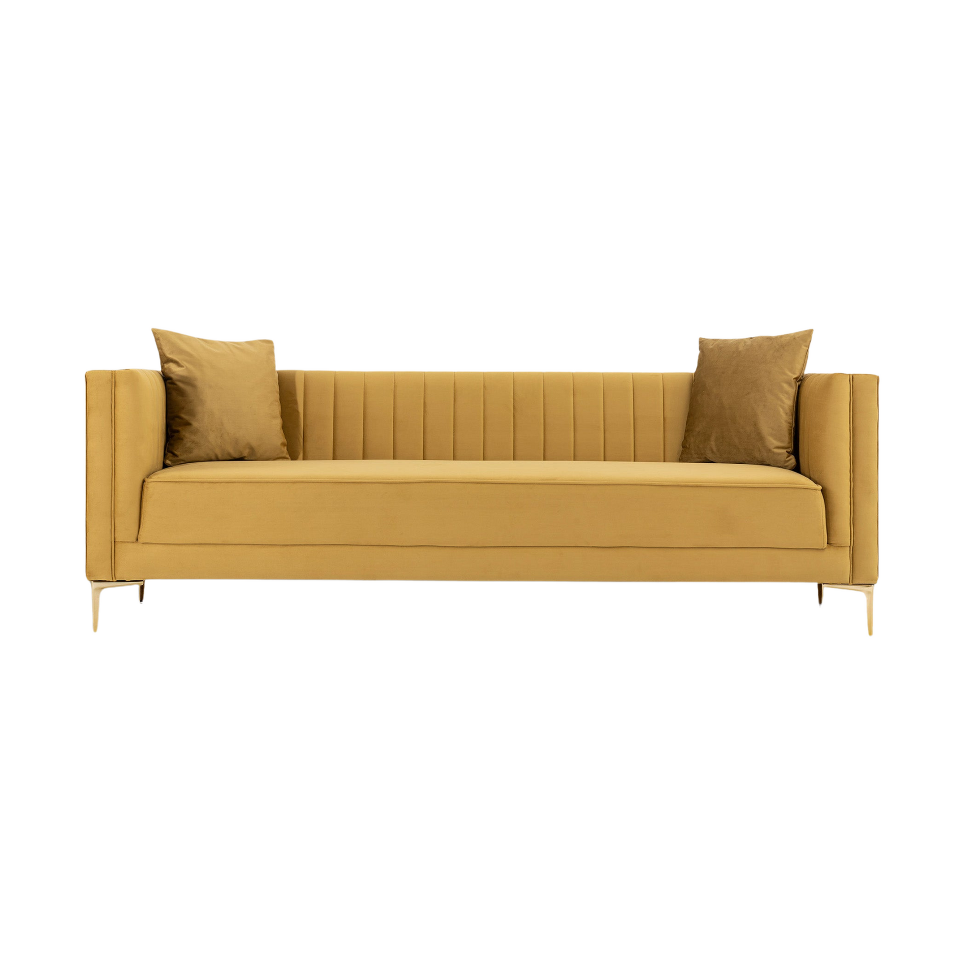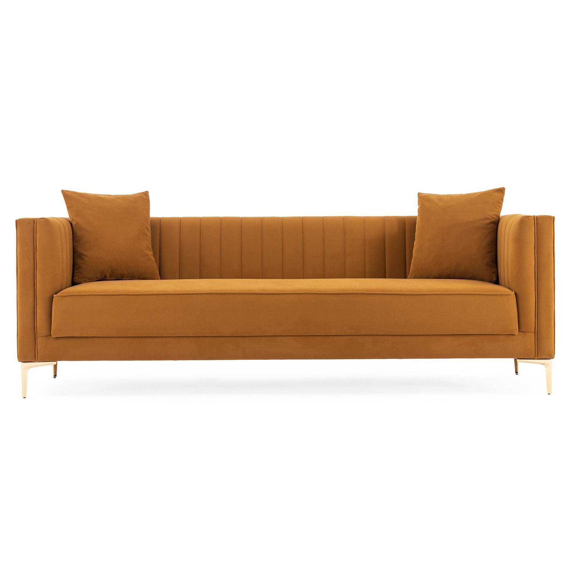 Elevate your living space with the Wren sofa, exuding mid-century modern style in luscious velvet. Boasting impeccable craftsmanship and luxurious high-density foam, this sofa is an essential statement piece for your living room, den, urban loft, condo, or home office. Its posh velvet material is easily wiped clean with a gentle, non-abrasive solution, and a swift wipe of a microfiber cloth. With removable legs, even tight spaces are no match for its effortless delivery. Available in an array of timeless hues, there's a color to complement any decor. The plush velvet fabric covers a durable foam-padded seat and back for ultimate comfort. Each material used, including the filling, is non-toxic and fire-resistant. The high-gauge sinuous springs provide a semi-firm support, while the solid and engineered wood frame with reinforced joints and kiln-dried components ensures long-lasting durability. Metallic legs finished in gold are removable, and its elevated construction