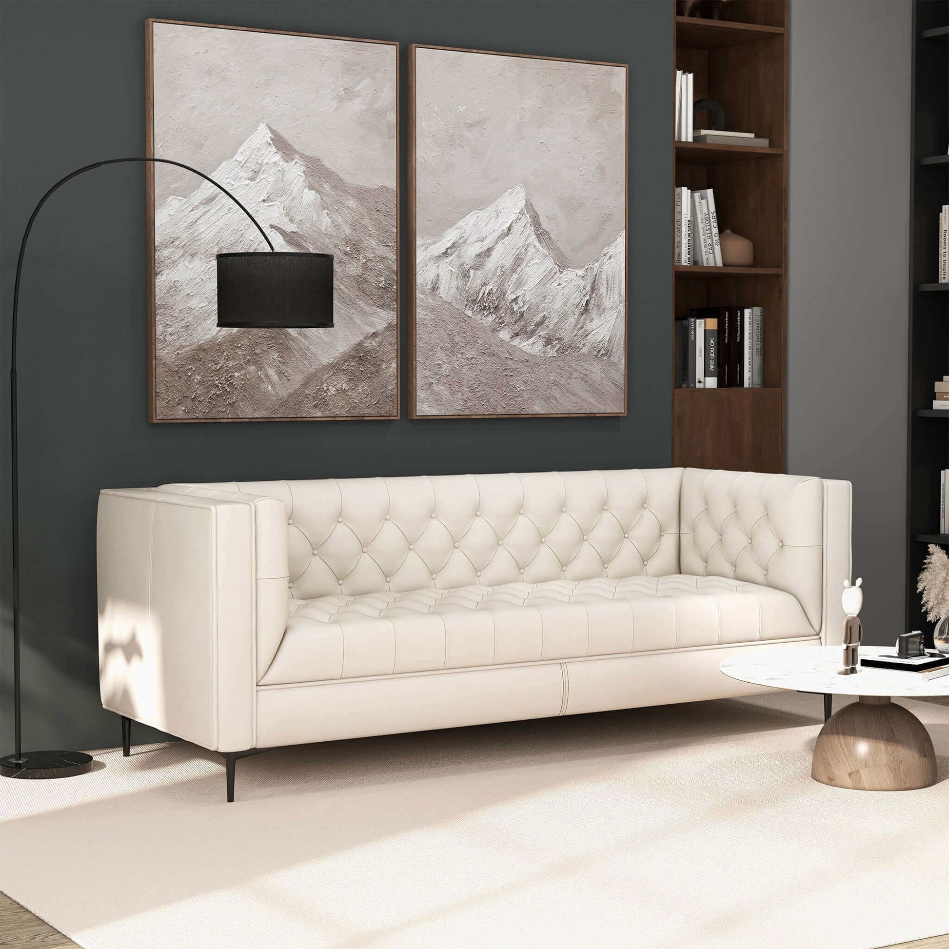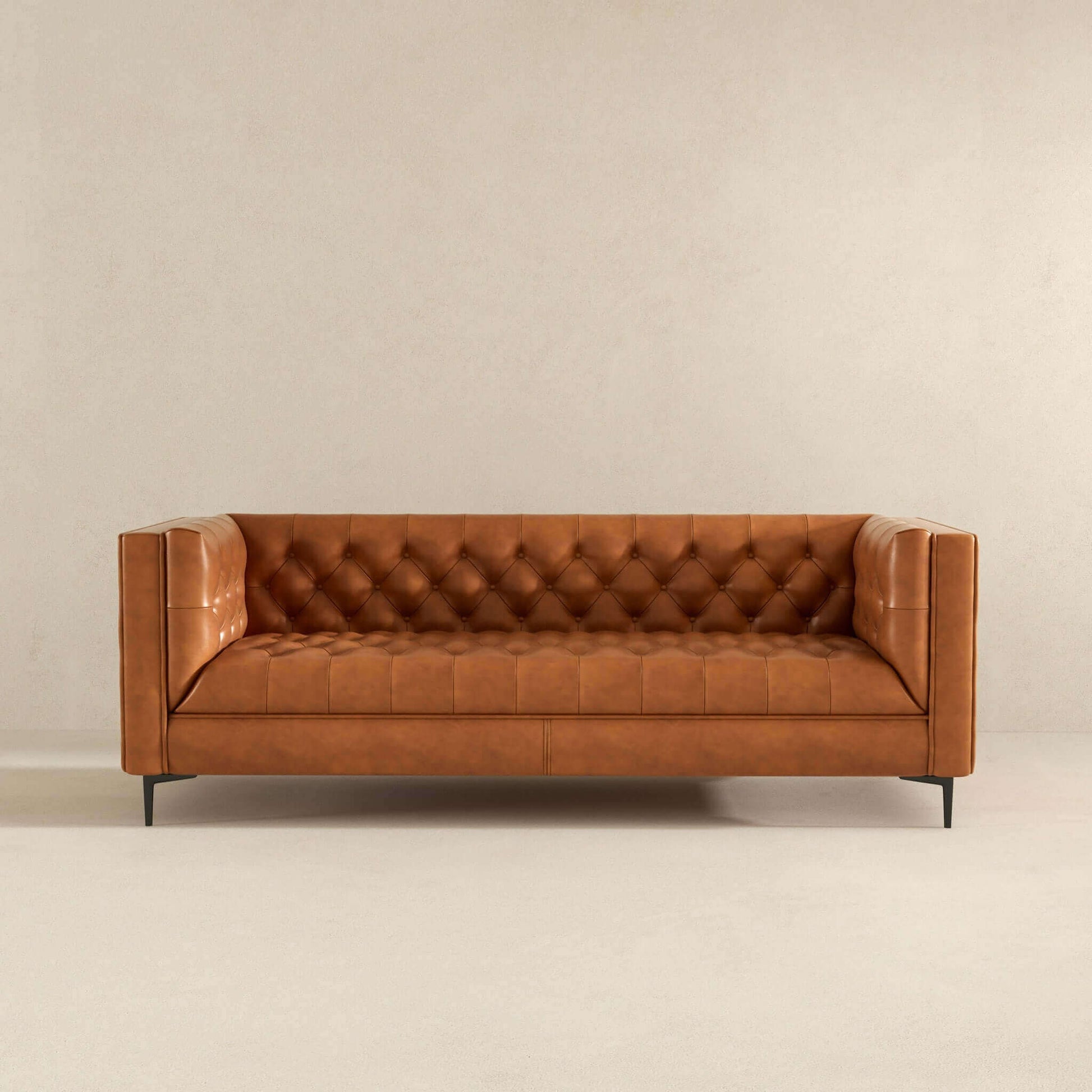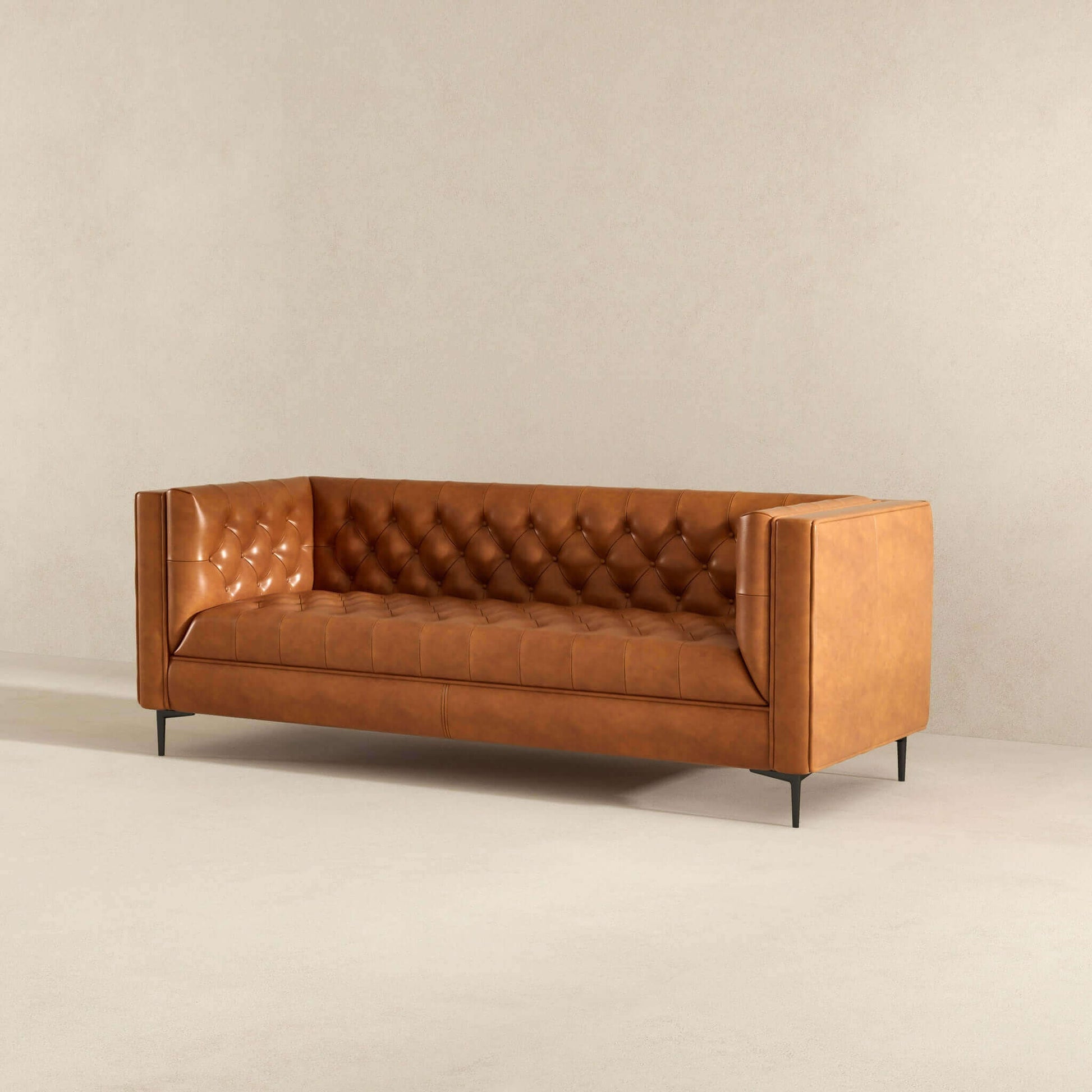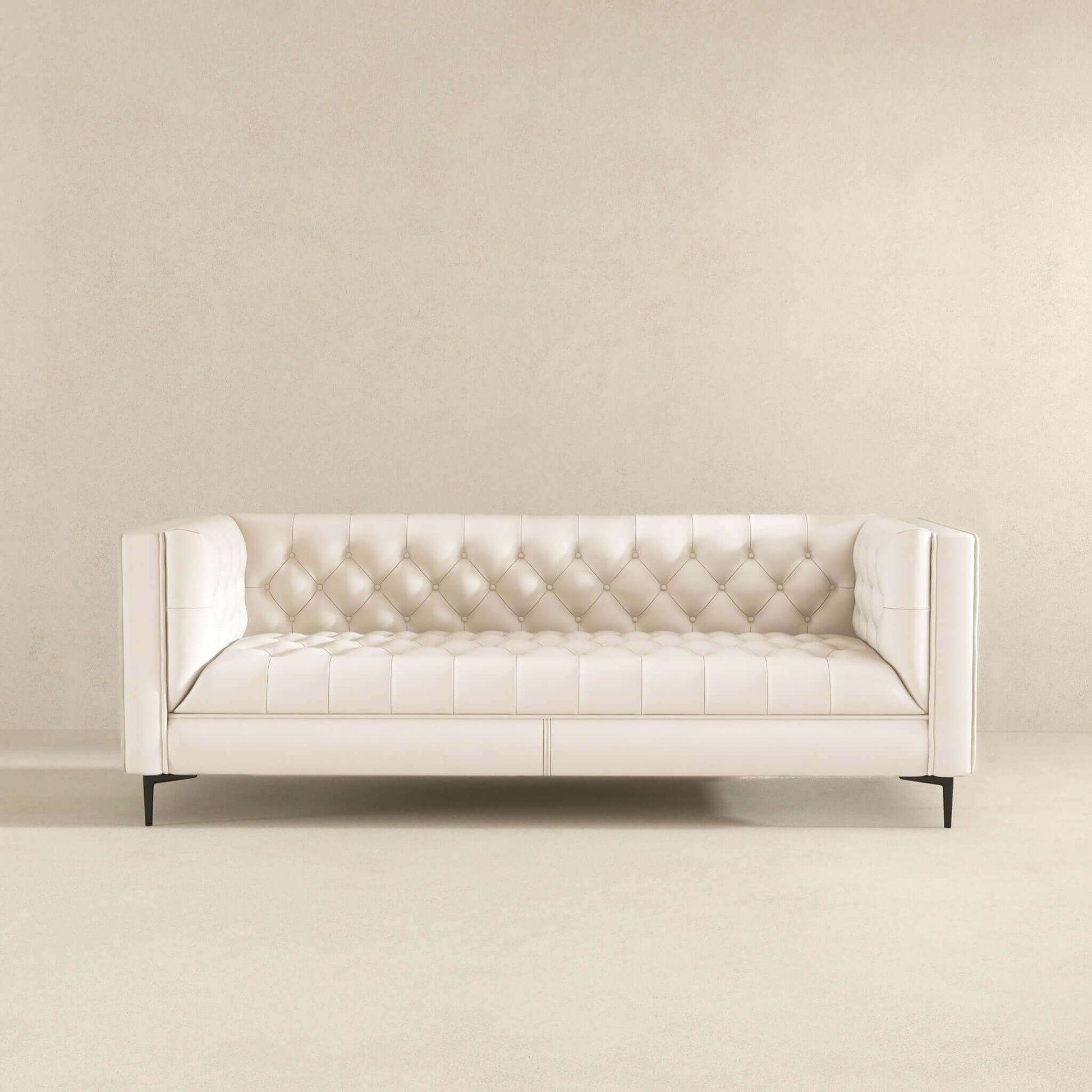 The tufted solid wood leg sofa is a luxurious and elegant piece of furniture that combines comfort and style. This sofa features a classic design with deep button tufting on the backrest and arms, creating a sophisticated and timeless look. Crafted with high-quality materials, this sofa is built to last. The frame is made of sturdy hardwood, ensuring stability and longevity. The seat cushions are filled with plush foam, providing exceptional comfort and support and adding to the overall luxurious feel of the sofa. With its generous seating space, this sofa is perfect for lounging and entertaining guests. Whether you're hosting a movie night or simply relaxing with a book, the tufted backrest provides excellent lumbar support, making it ideal for those who value both style and comfort.