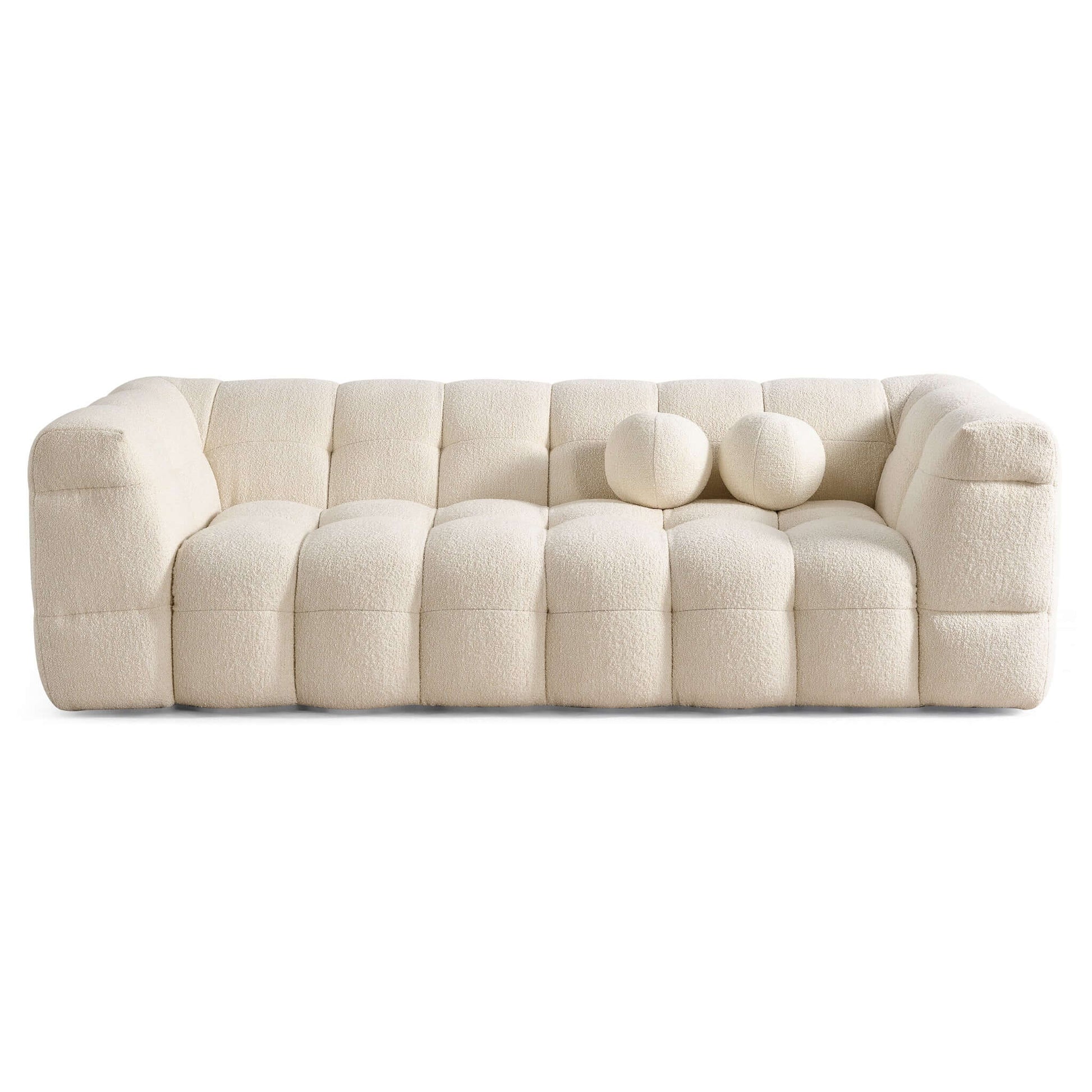 Experience unrivaled comfort and luxury with our Ivory Boucle 3-Seater Sofa, where mid-century modern charm meets contemporary allure. This living room masterpiece features elegant ivory boucle upholstery, setting the stage for a sophisticated ambiance. The 3-seater design offers ample space for social gatherings, while the carefully crafted puffy structure invites you to relax in ultimate comfort. As its name suggests, this affordable sofa is a chic investment in understated elegance, elevating your home without breaking the bank. Complete with a mid-century modern tufted design, 4 square and 1 ball contemporary toss pillows, and high density semi-firm foam, this sofa is a must-have for any stylish home.