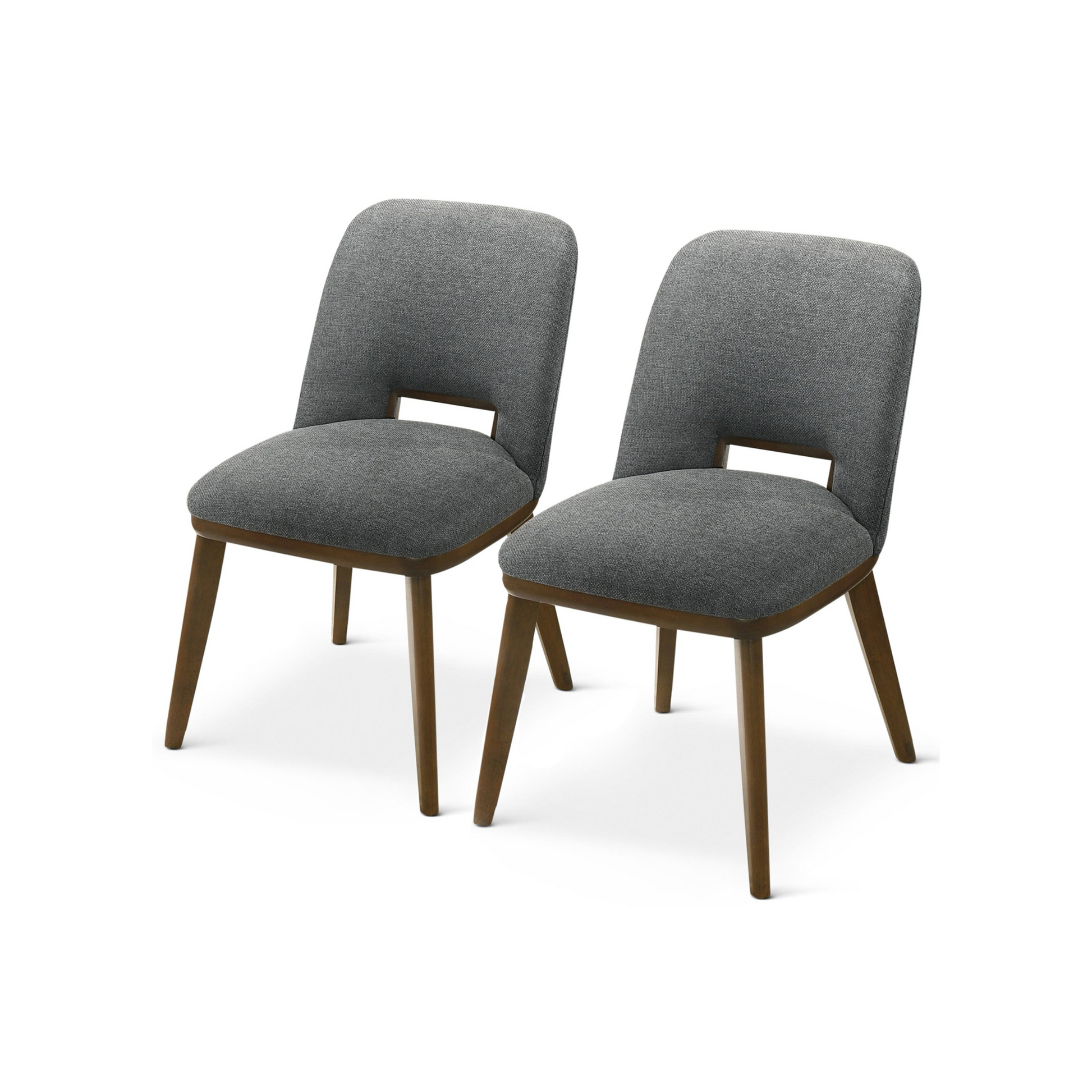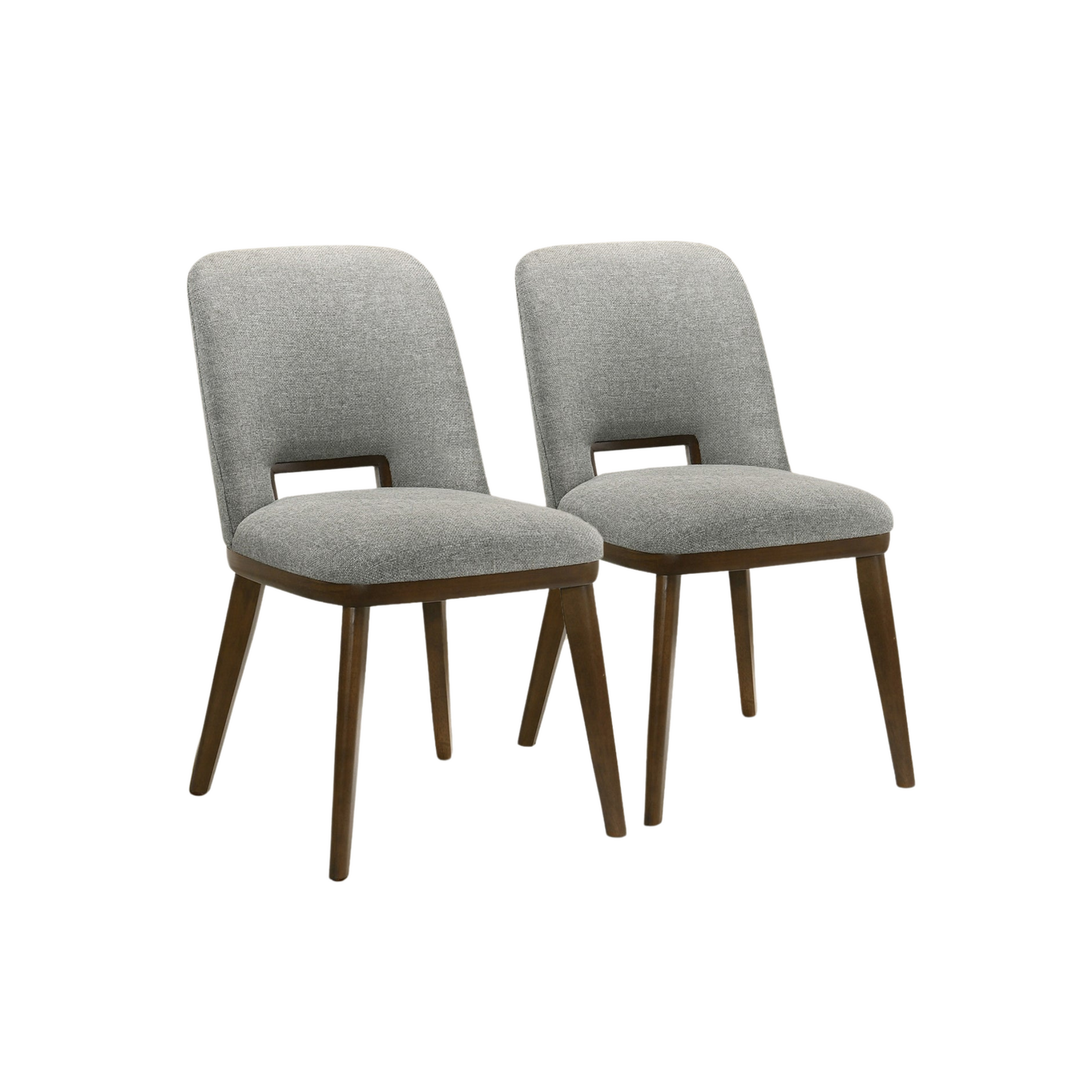 Presenting our Lucian Dining Chairs - a perfect fusion of opulence, sophistication, and practicality for your living spaces. Meticulously crafted with a sturdy, walnut-colored solid wood base, these dining chairs effortlessly emanate the charm of mid-century modern design to elevate your home. The set of 2 chairs, upholstered with soft, textured fabric in a delicate shade of gray, exude an air of elegance while ensuring a comfortable dining experience. With a versatile design, these chairs are not limited to the dining room - they also make a stylish addition to your study or any other living space where comfort meets fashion. The seat and back are luxuriously padded with foam, beckoning you to indulge in moments of relaxation. The solid wood base, in a rich walnut hue, not only adds a touch of tradition but also guarantees long-lasting durability, making these chairs a valuable investment for your home. Whether hosting a dinner party or seeking a cozy seat for your study, our Modern Dining Chairs