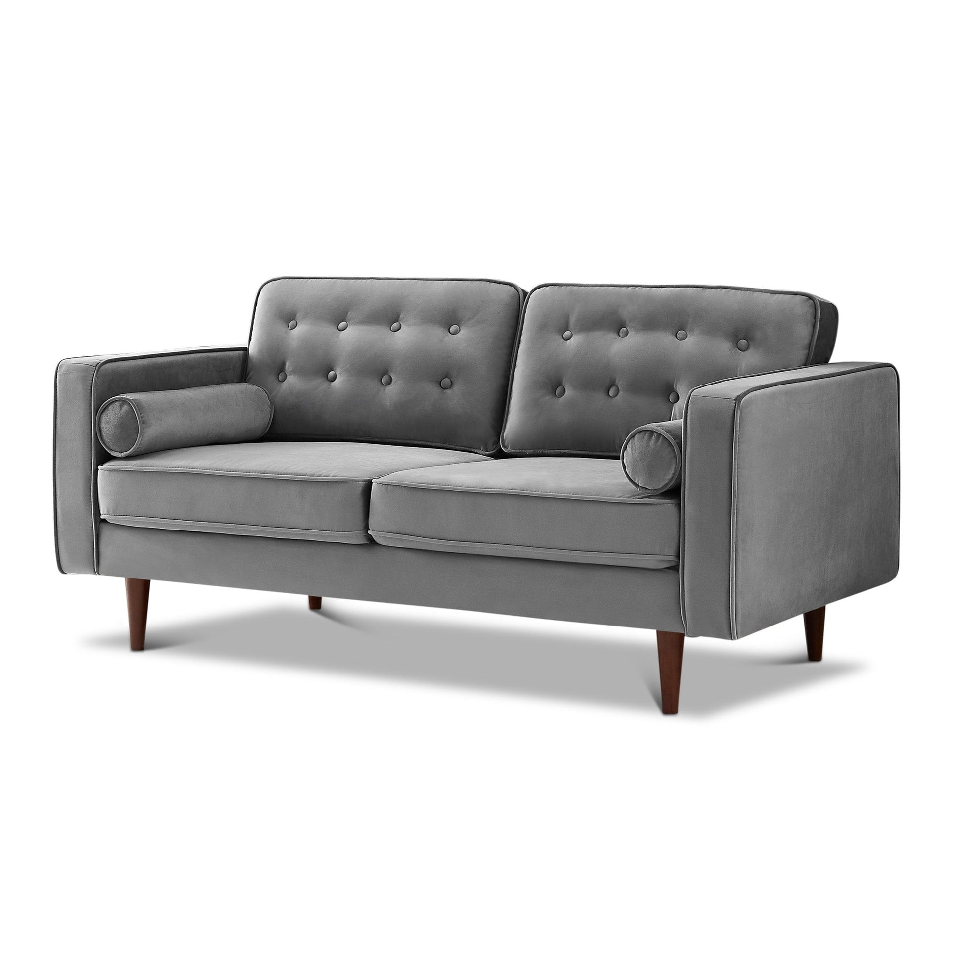 Understated silhouette with major mid-century modern vibes? The Bellamy velvet Loveseat in blue is what you're looking for for your living room! Founded atop four walnut-finished legs, this piece is crafted with a solid wood frame, high-density foam padding which lends comfort to the seat. Upholstered in durable, high-quality velvet, this tasteful piece features elegant square arms, a removable back cushion, for convenience. Can be cleaned with a non-abrasive cleaning solution followed by a quick microfiber cloth. Removable legs allow for simple delivery for tight spaces. Available in a variety of timeless colors, you're sure to find something that matches your decor