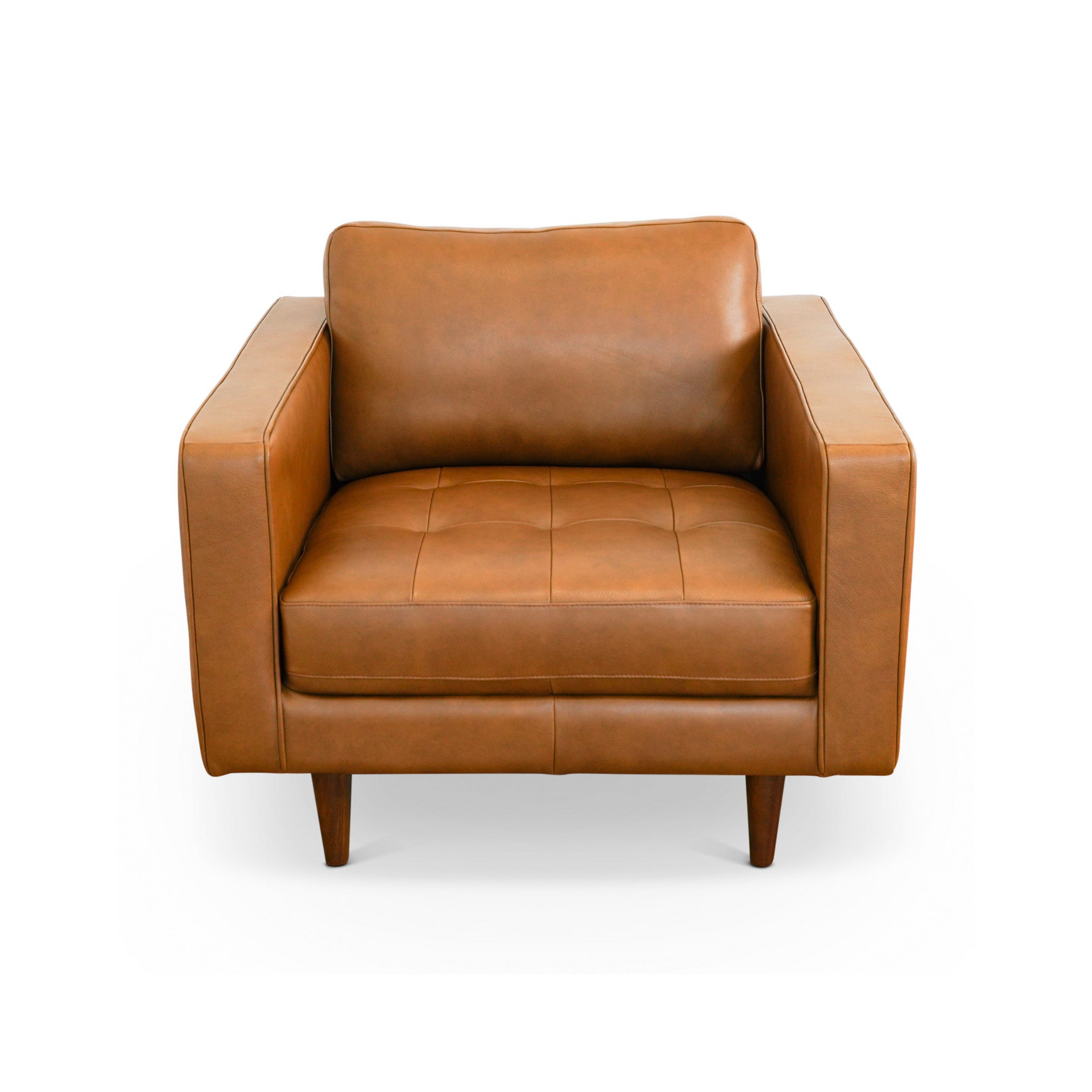Add an extra spot to the den or living-room for movie nights or accent your master suite ensemble with the Lysander Mid-Century Modern Tan genuine leather Armchair. Founded atop four walnut-finished legs, this piece is crafted with a solid wood frame, high-density foam padding which lends comfort to the seat. Upholstered in durable, high-quality genuine leather, this tasteful piece features elegant square arms and fully padded back cushion for great support. Can be cleaned with a non-abrasive cleaning solution followed by a quick microfiber cloth. Removable legs allow for simple delivery for tight spaces. Available in a variety of timeless colors, you're sure to find something that matches your decor
