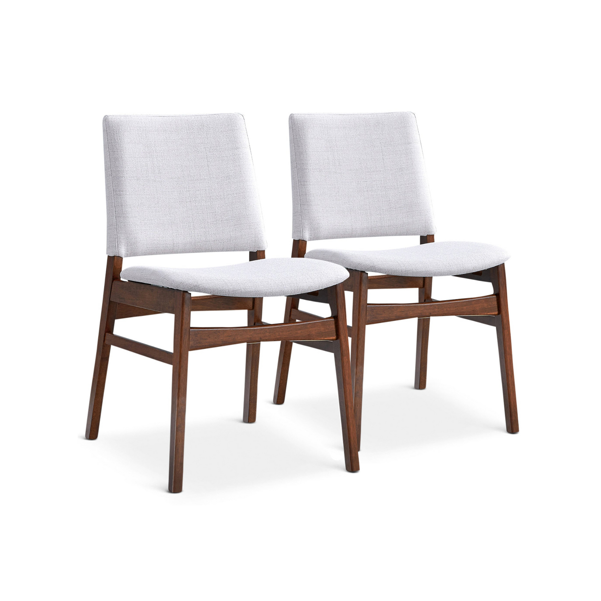 Introducing the Yatesbury Mid-Century Modern upholstered dining chair set, available in a convenient pair. These chairs are the perfect addition to complete your dining room or kitchen. Crafted with a durable Solid Wood frame, they offer exceptional stability and longevity. The high-density foam cushion ensures a comfortable seating experience with reliable back support. Cleaning is effortless, as the chairs can be wiped down with a non-abrasive cleaning solution and a quick swipe of a microfiber cloth. With minimal assembly required, you can swiftly begin hosting and entertaining without any hassle. Upholstered in a Soft Textured Fabric in Light Grey, Solid Wood Legs and Frame, Foam-Padded Seat and Back, Mid Century Modern Design